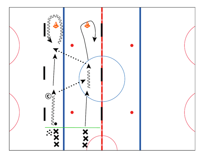 Coach draws lines on the ice to designate starting point for the players and places cones at the far end in front to the lines.