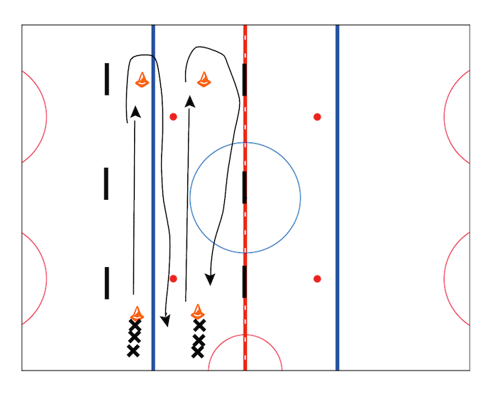 Coach draws lines on the ice to designate starting point for the players and places a cone at the far side of the ice inline with the player line.