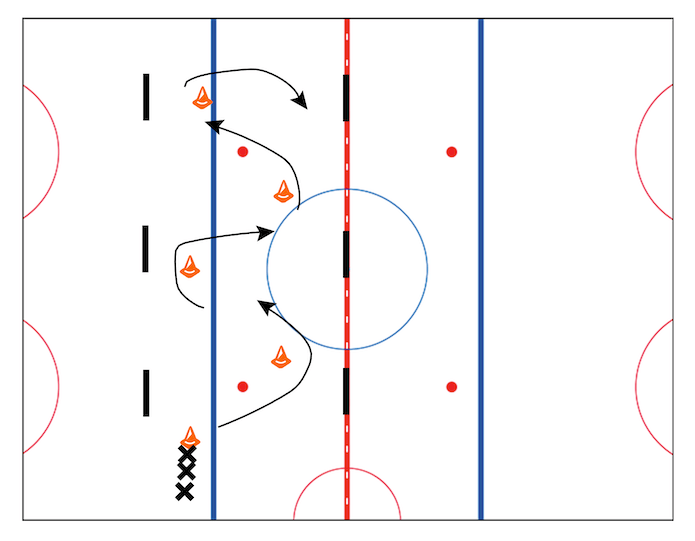 At the cone players perform crossovers and skate back to their line.