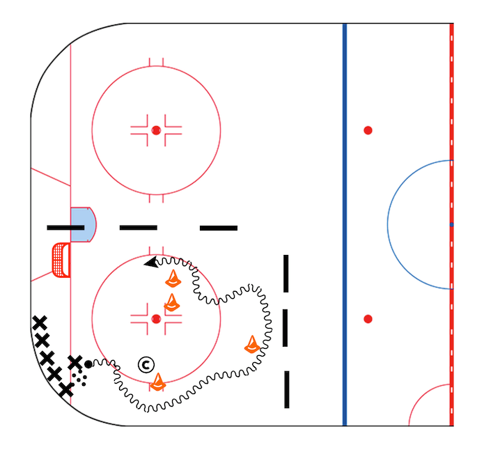 Coach draws lines on the ice to designate starting point for the players and places 4 cones in the drill area. 2 cones in front of the line, a cone at the top drill area and 2 more in front of the net.