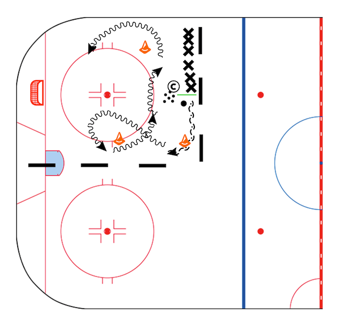 Coach draws a line to mark the start of the drill and sets 3 cones. One near the upper corner of the drill, another near middle hashmarks and one near the top of the circle close to the boards.