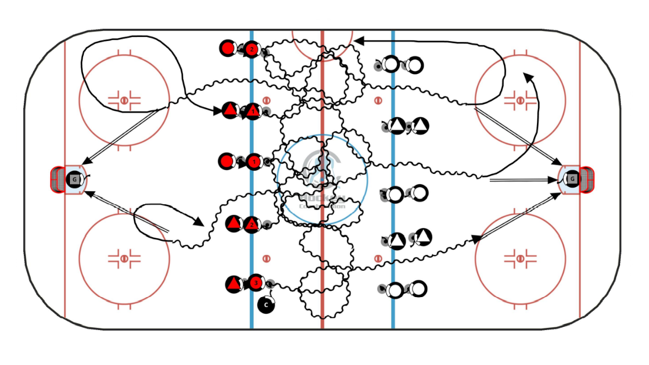Two teams line up on opposite blue lines. Start with 5 players from one side who move into the middle zone stickhandling in a random pattern. After 10 seconds, forwards skate forwards into the opposite zone for shots as defensemen go back towards the other zone for shots. The coach starts the second line of players 5 seconds after the first group so that 10 players are skating randomly in the middle. The coach starts the next line every 10 seconds so both sides alternate.