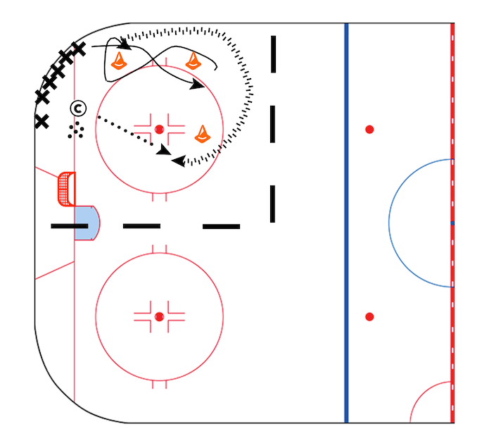 After the second cone the player attempts to crossover around all the cones to the middle of the ice.