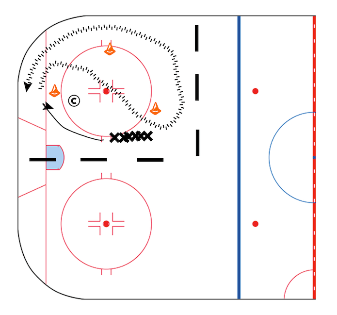 The player then skates to the next cone and turns in the opposite direction and again uses their crossovers to accelerate all the way around the board side hashmarks, below the red line and then back into line.