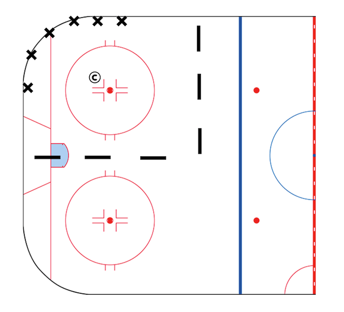 Players perform different stationary skating techniques under the coaches direction while using the wall for balance.