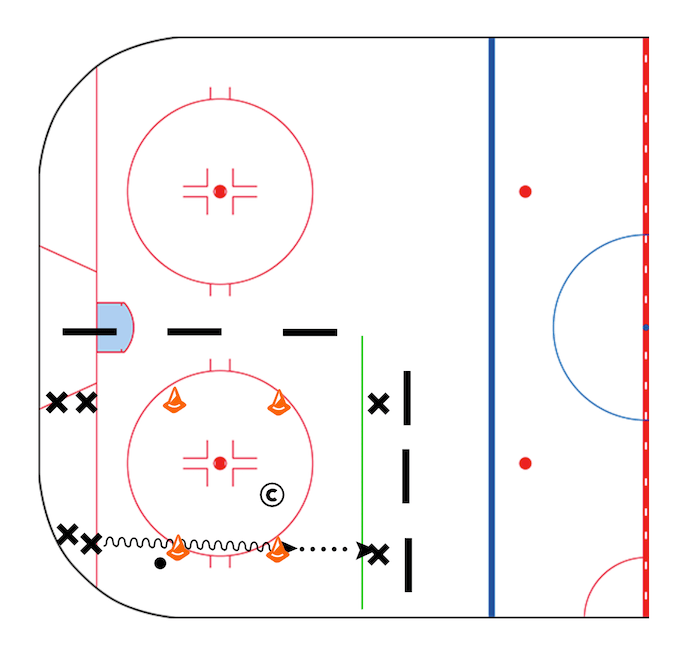After the second cone the player passes the puck to the player waiting on the opposite side.