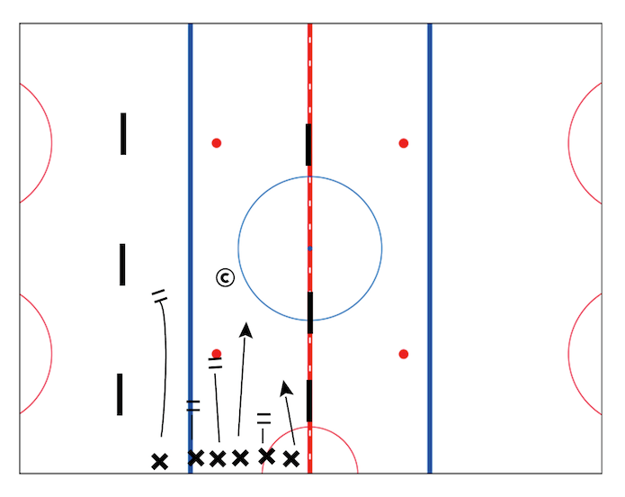 When the coach says "Go" or "Green Light" players skate towards the far side.