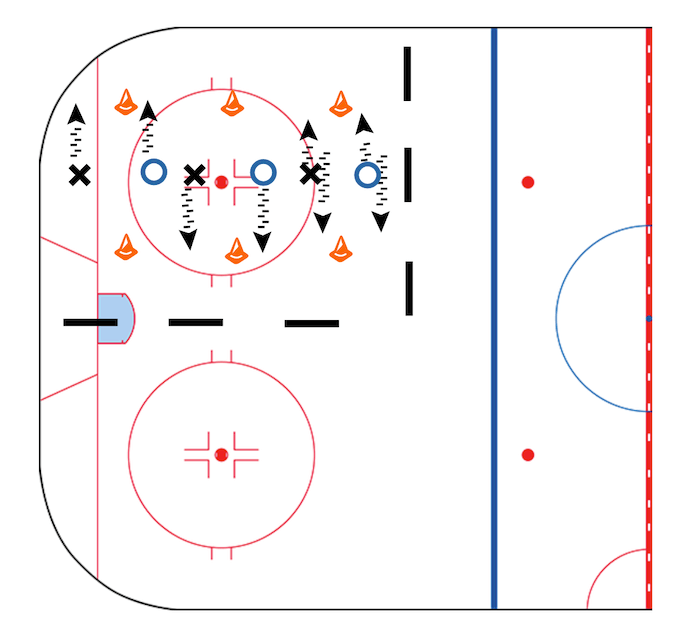 Shadow Lateral Crossovers challenges players to work on their footwork and stops. Encourage players to compete and work hard to keep up.