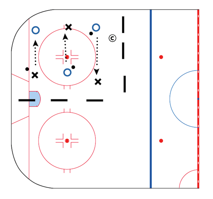 Taking turns they pass the puck back and forth practicing various passing techniques.