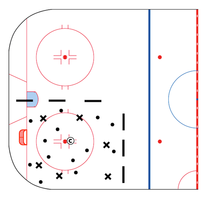 Role play to increase fun factor for kids. Players are the squirrels and the pucks are the acorns. The squirrels need to put as many acorns as they can in the tree (the net).