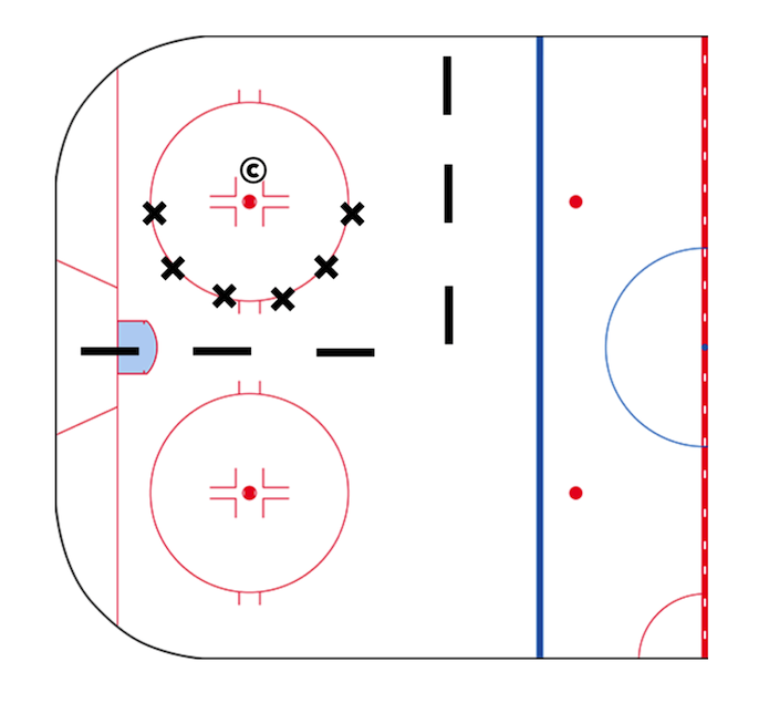 Draw an X for each player to stand on the ice. Coach leads drill with various stationary exercises: