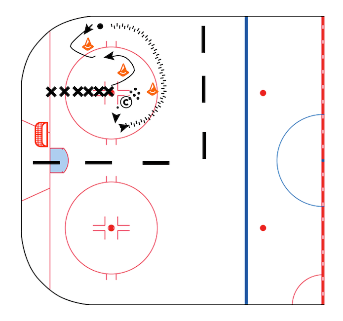 The player then skates below the second cone and performs a tight turn towards the top barriers. As the player performs the second turn they then accelerated out of the turn using their crossovers.