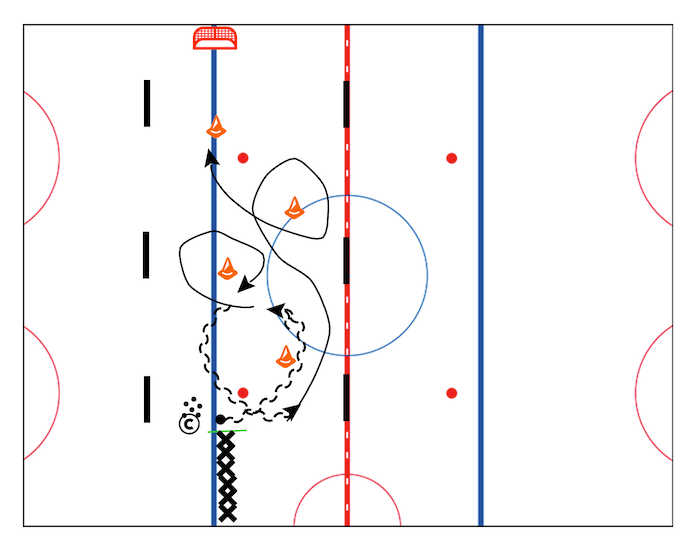 Coach draws a line on the ice to indicate starting point and places 1 cone 15-20 feet in front of the line and another 15-20 feet staggered off the net.