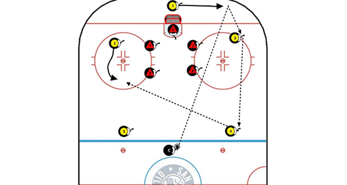 Once the players make it past the blue line, the coach can send the puck to the opposite side, from before, sending four players in the other direction.