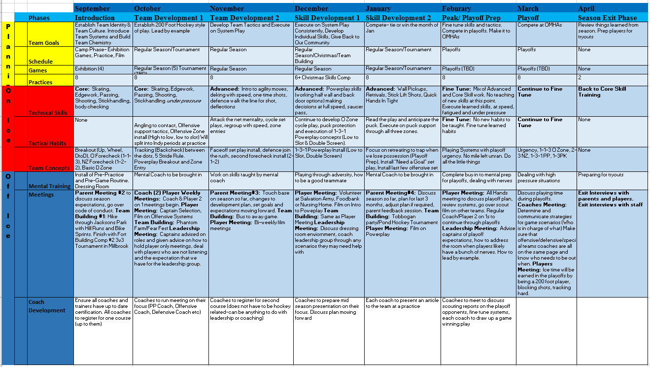 Again, for the sake of your time and eyes, we won't go into a huge amount of detail here, but the Season Categories are the items on the left of the plan in yellow, red and blue. Yellow are a part of the Planning phase, red are the On-Ice phase and finally blue is obviously the Off-Ice phase. The design of these is to put a plan in place that can both be concrete, yet adaptable if needed. Its a receipe and as such needs the perfect blend of all 3 focuses for each block. You can create any design you would like for these, I just found a presentation from Hockey Alberta years back and learned this setup, and like any decent coach, made a few adjustments. I do strongly recommend you separate the Categories however as it allows you to have a direct line of sight in terms of the commitment requirements for each.