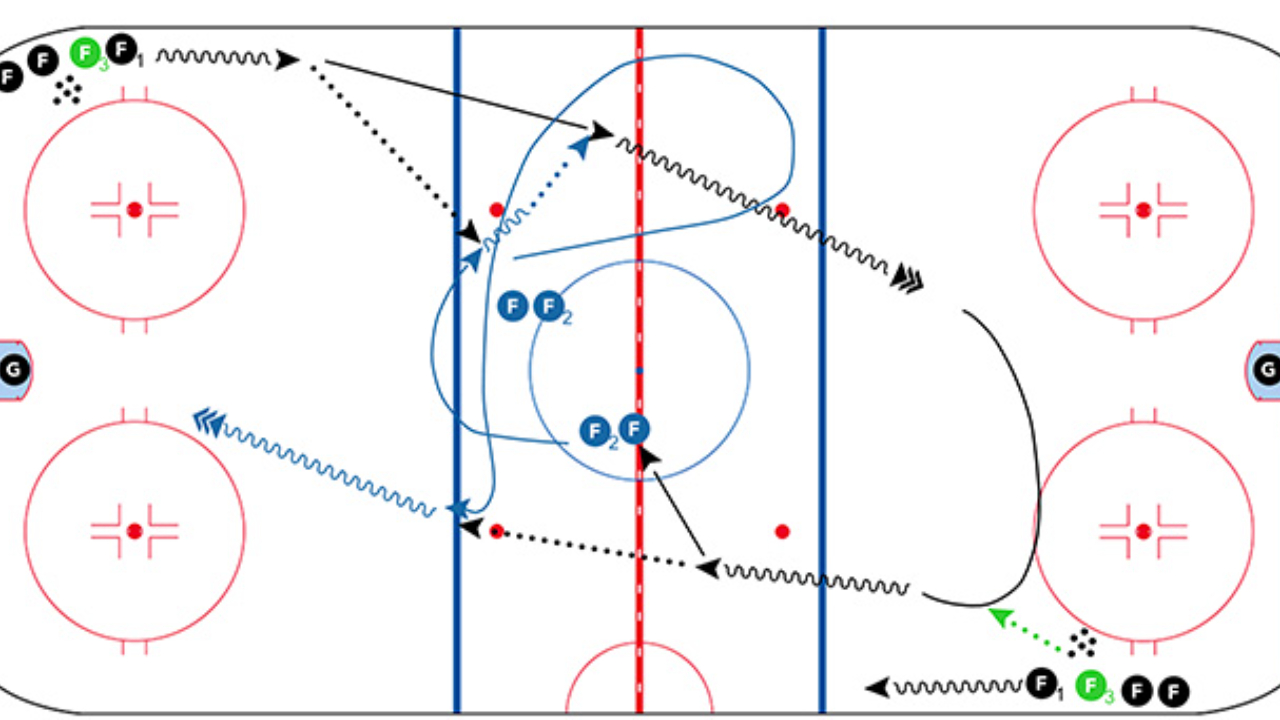 Running at the same time in each direction, this drill once again sees the short pass made to a neutral zone player. This drill, however, really focuses on timing because once the player gets the pass, they need to make a quick return pass and have to quickly loop back to the other side to take another pass and head in for a shot.