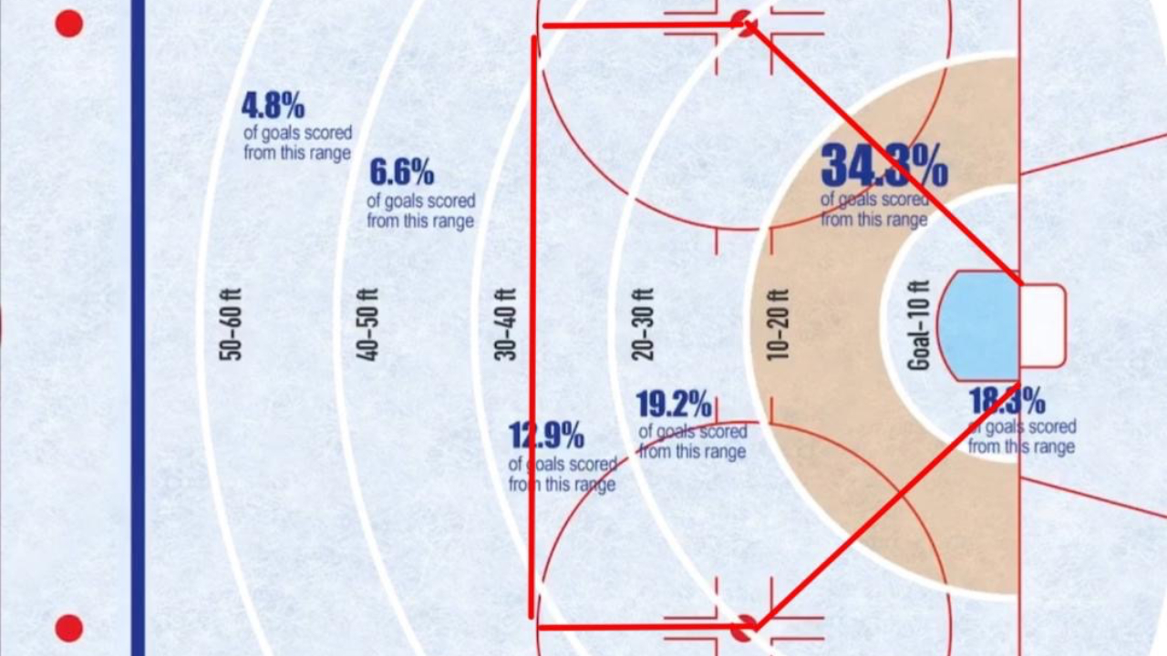 The chart from the 2018-19 NHL Scoring Range Chart reveals the areas and distances in the Offensive Zone where the majority of goals are scored from which is important. The HOUSE is often referred to as the Prime Scoring Area {PSA} and the Game Within The Game, the area from the top of the face off circles to the net. The goals scored range drops the farther you get from the net: