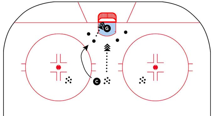 We sometimes do variations where if the goalie does absorb the shot, we don’t rush in as a reward for not giving up a rebound. We can also place a coach lower down near the net where the initial shot may turn into a pass for a backdoor goal.