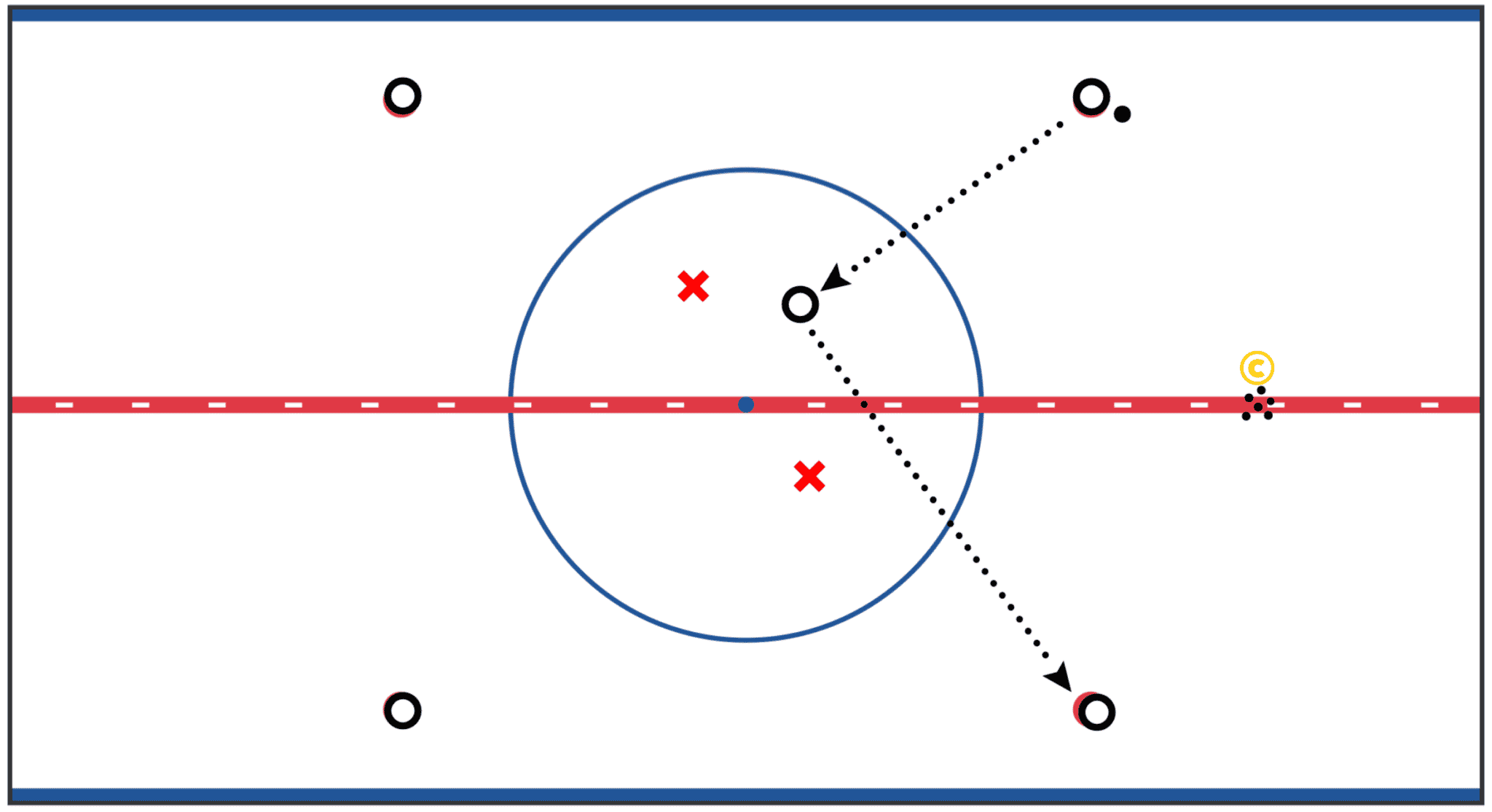 A puck possession based game that can be played with multiple groups at a time. Teams can simulate their power play set ups, while penalty killing can be simultaneously worked on by the defending players. The defending team can have one to three players depending the the difficulty & stress you are looking to put the offensive players under. Offensive players can also be encouraged to move along the outside, interchange positions with each other, including the middle support player.