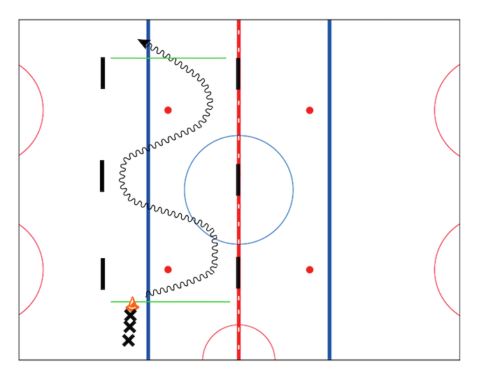 Coach draws lines on the ice to designate starting point and end point on either side of the zone. Players line up behind the line on one side near the border.