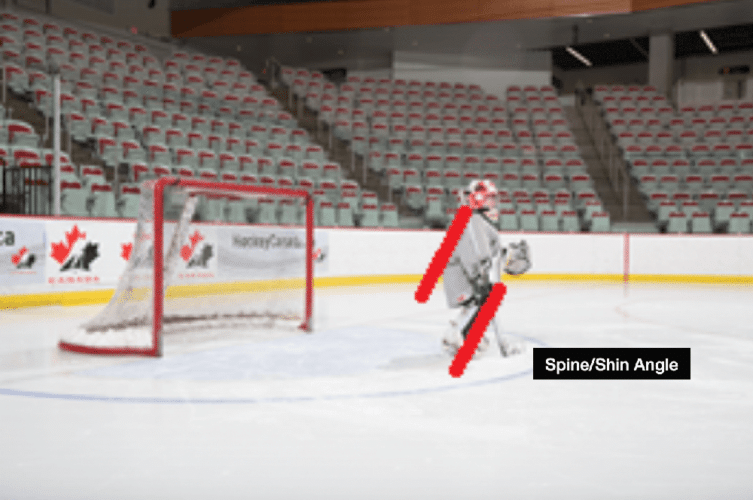 Over the past 20 years of coaching and scouting goalies, I can comfortably say there are as many variations in the stance as there are goalies. Every goalie is different, however there are some fundamental elements that are key to a successful, practical and efficient stance. To start there has to be balance, good posture and symmetry in the stance to minimize effort in movement and save selection. Everything starts in the feet/skates; if the skates aren’t parallel and the weight not over the ball of the foot, then you cannot execute with efficiency. The spine angle should match the shin angle, which helps create balance over the edges, as pictured above.