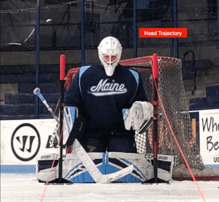 The head/eyes need to be tilted down towards the ice. This is the basis of “Head Trajectory;” the eyes/nose/chin initiates all movement. The goalie needs to see the puck, with their eyes and shoulders over the puck to fill the most amount of net. As the head raises and lowers the eyes have to blur and adjust, which creates visual inefficiencies.