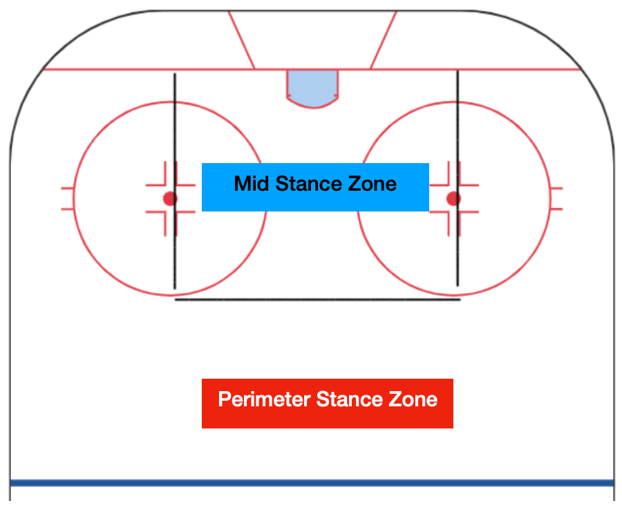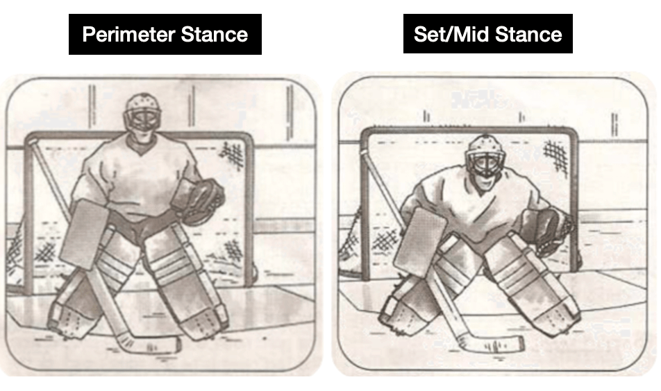 In the NHL and in many pro leagues, we are staring to see two different types of stances, the perimeter stance and the set or mid stance. What the best coaches and goalies have found is that if the puck is above the circles or outside of the dot lane, the goalie can take a slightly taller and narrower stance (perimeter stance). The goalie is slightly taller in the chest and the knees. This allows the goalie to be in a more relaxed but ready state, allows them to get better visuals in traffic and having less tension in the body helps goalies track off the puck. Goalies have been told for years, to “get set” once the puck is in the zone. The issue with this has been fatigue, both mentally and physically. Young goalies struggle to stay engaged in their stance for the entire time the puck is in play below the red line. In adopting the perimeter stance, goalies are in a set a ready position, that will create less fatigue. When young goalies are low and locked in, they tend to get tunnel vision. The perimeter stance will have the goalie in a more relaxed state than the set stance, where we can work on tracking off the puck and can allow the goalie to hold their edges better when moving. In the perimeter stance, movement on the skates (standing) is easier, when low and locked in most goalies put themselves in a spot where their only option is to slide on a pass, regardless of puck proximity to the net. Therefore in developing and utilizing the perimeter stance we can help teach goalies patience on their edges and increase efficacy of movement.