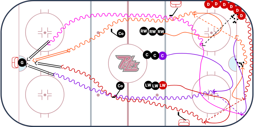 D makes hard punch turn goes behind crease picks up another puck and feeds C who has cut low. Centre goes up ice.