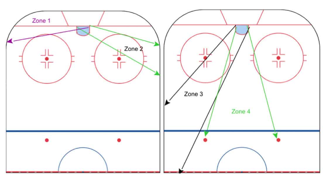 This is a system that I took from Mike Lawrence and Pro Goaltending, it helps the goalies simplify the play. The positions or footing are not absolute but help the goalie create a starting point for plays entering and in-zone. They will always be adjustments for optimal position, but if we can simplify positioning then the goalies will be able to quickly identify where they are and maximize tracking the play. Zone 1 is the space at either side of the net, from below the bottom of the face off circle to the end boards (Dead Angle). Zone 2 is on either side of the net, from the bottom of the face off circle to the face off dot (Bad Angle). Zone 3 is on either side of the net, from the face off dot in zone to the face off in the neutral zone.