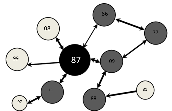 As seen in the image below, 87 is a player whom many teammates perceive as a leader. However, we also see that player 87 acknowledges the leadership of player 08. Interestingly, player 87 recognizes leadership in player 99, but player 99 does not reciprocate. This exercise provides a visual representation of the leadership dynamics within the team.