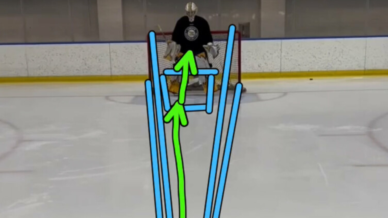The goalie in this drill is focusing on drifting into position and setting as he reads the release. With younger or less experienced goalies, you want to start the shooter above the circles to give them time to read the release. We do not want the goalies dropping on a high shot and trying to make a save over their shoulder while in the butterfly. The focus is patience and reading the release. We want the goalies to become comfortable and confident on their edges, reading the release and trusting that they can get down on a low shot.