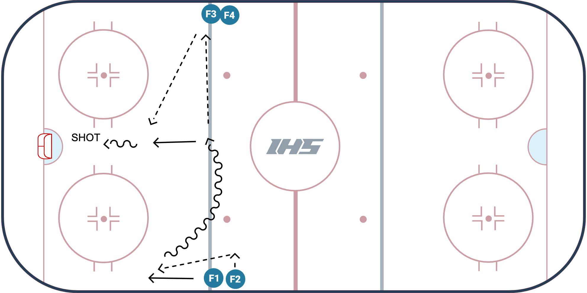 - The drill will then start again, but on the other side, this time with F3 starting backward, receiving the puck from F4.