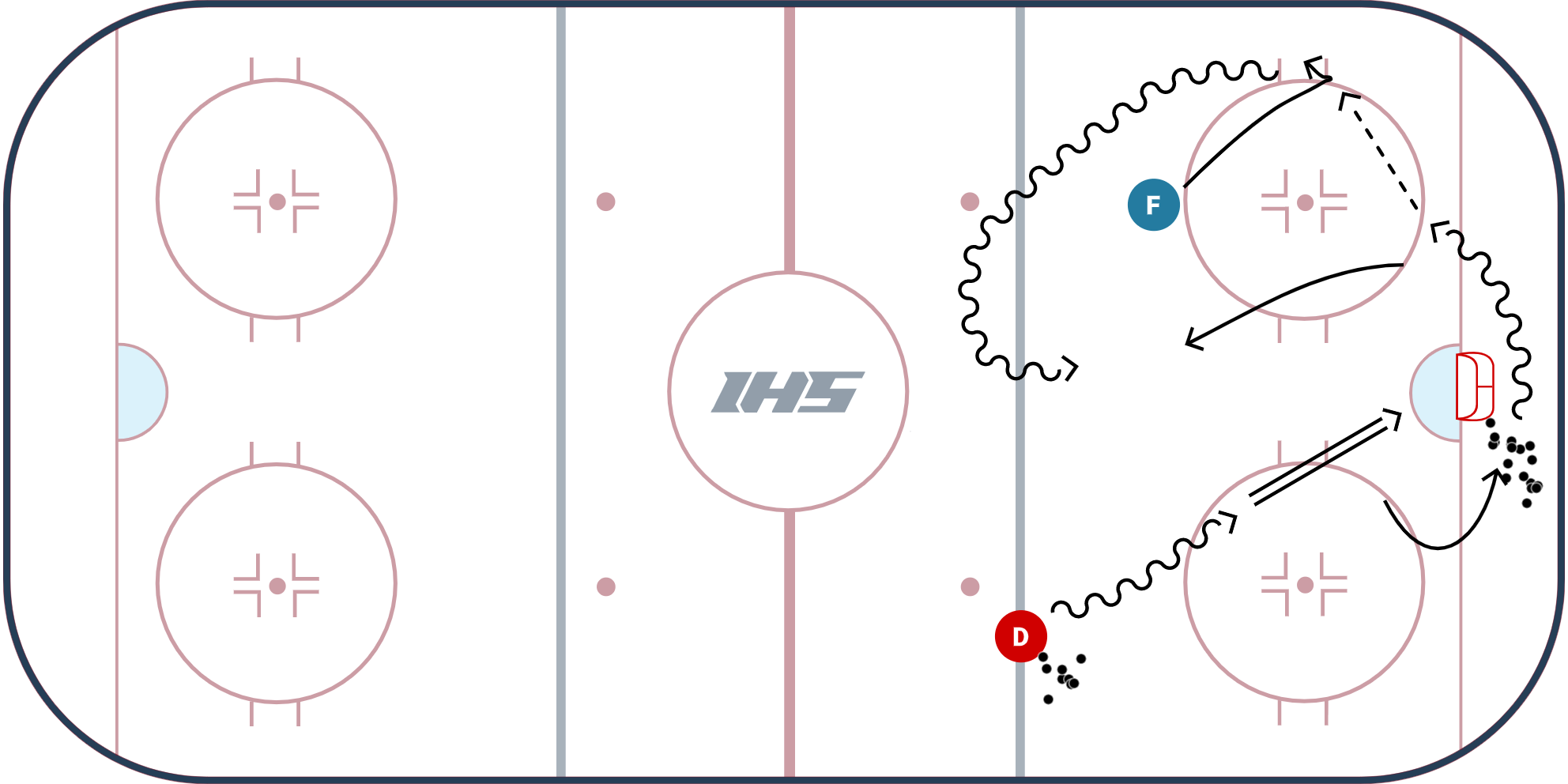 - The first forward in the line will wait for the defenseman to take a shot on net and start creeping to the bottom of the circle. The forward will transition backward opening up for a pass from the defenseman behind the net.