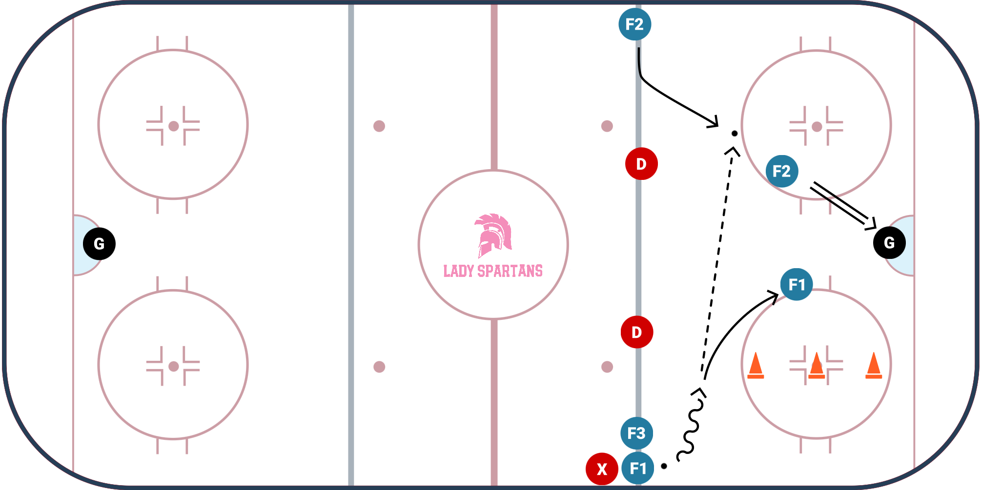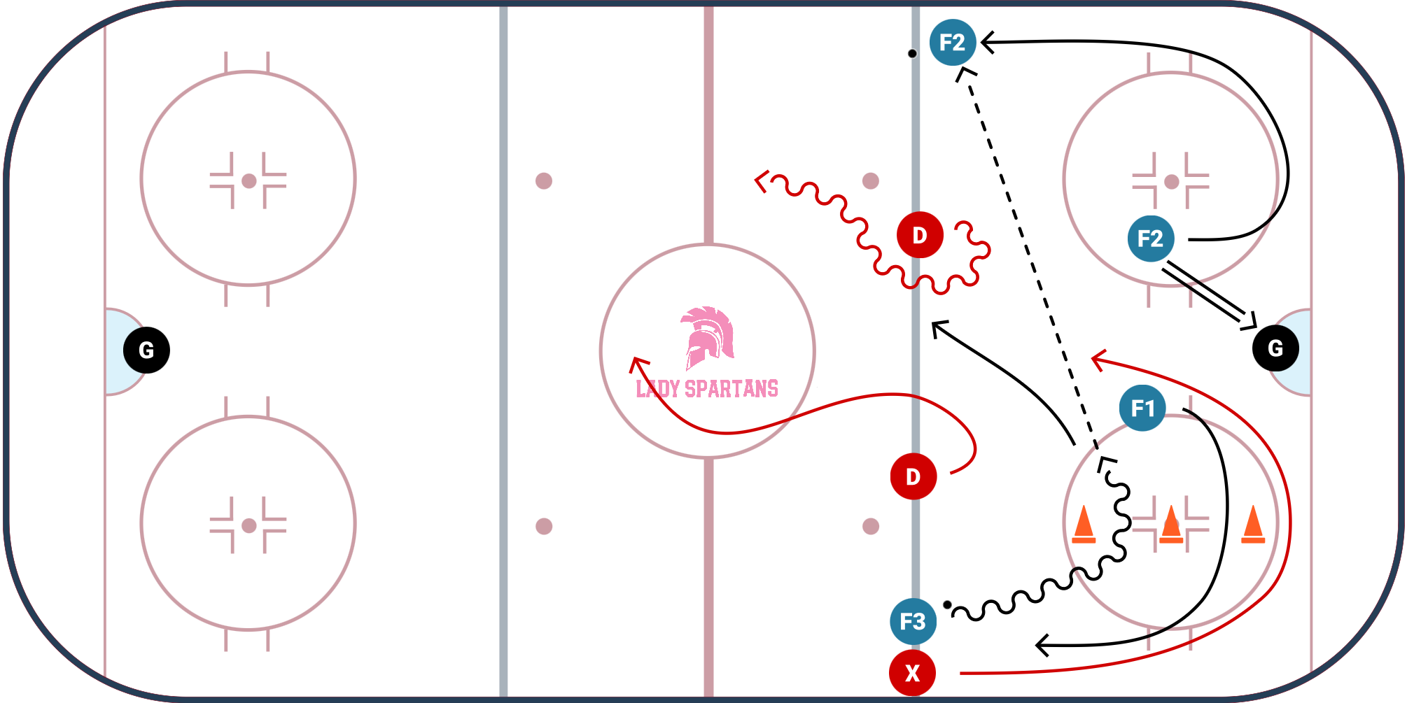 - F3 makes the decision to release off the line, their route has them first passing though the 1st & 2nd cones and breaking toward the middle of the ice (think 45 degrees, players can make adjustments as they work through reps)