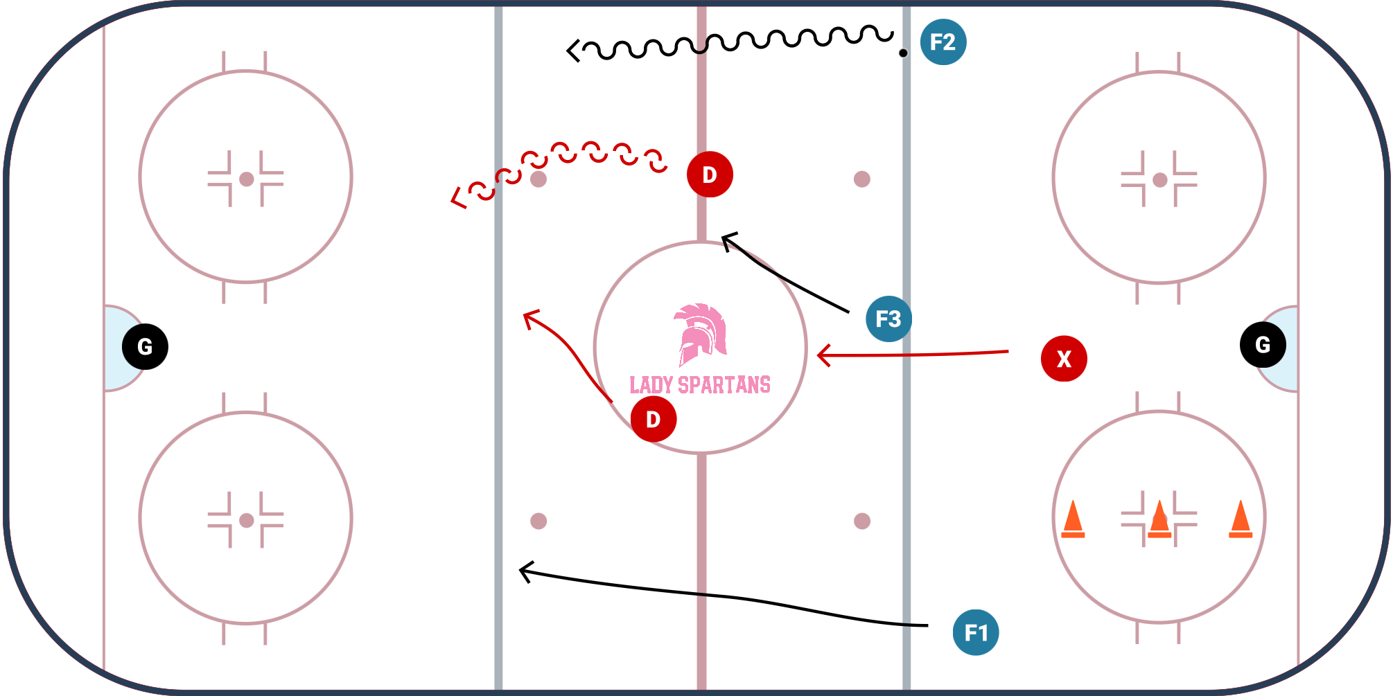 - F1, F3 and the player tasked with back checking will line up at the blue line on the same side as the circle containing the 3 cones.